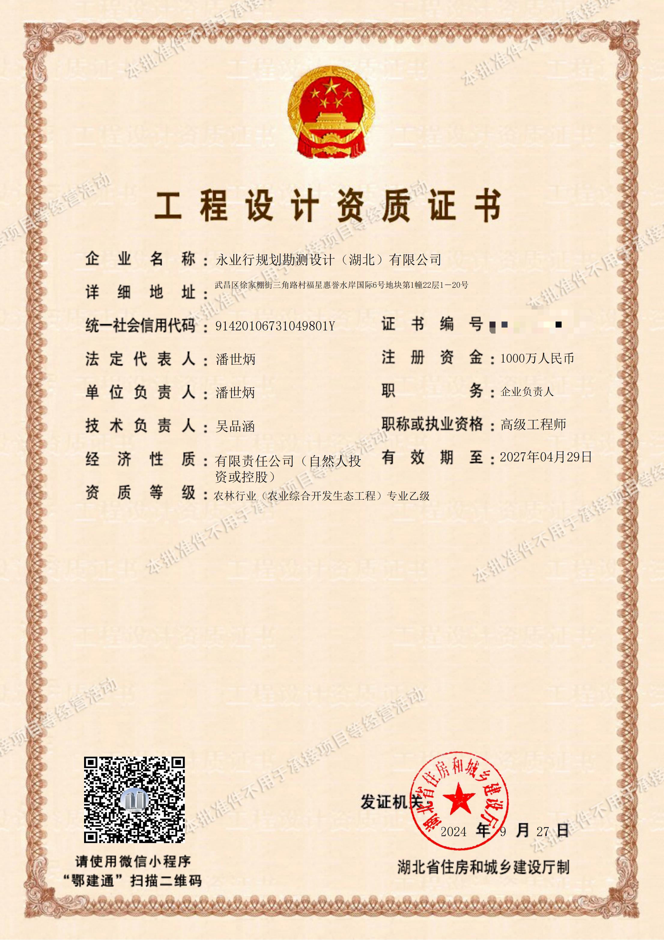 工程设计乙级资质证书-农林行业(农业综合开发生态工程)专业