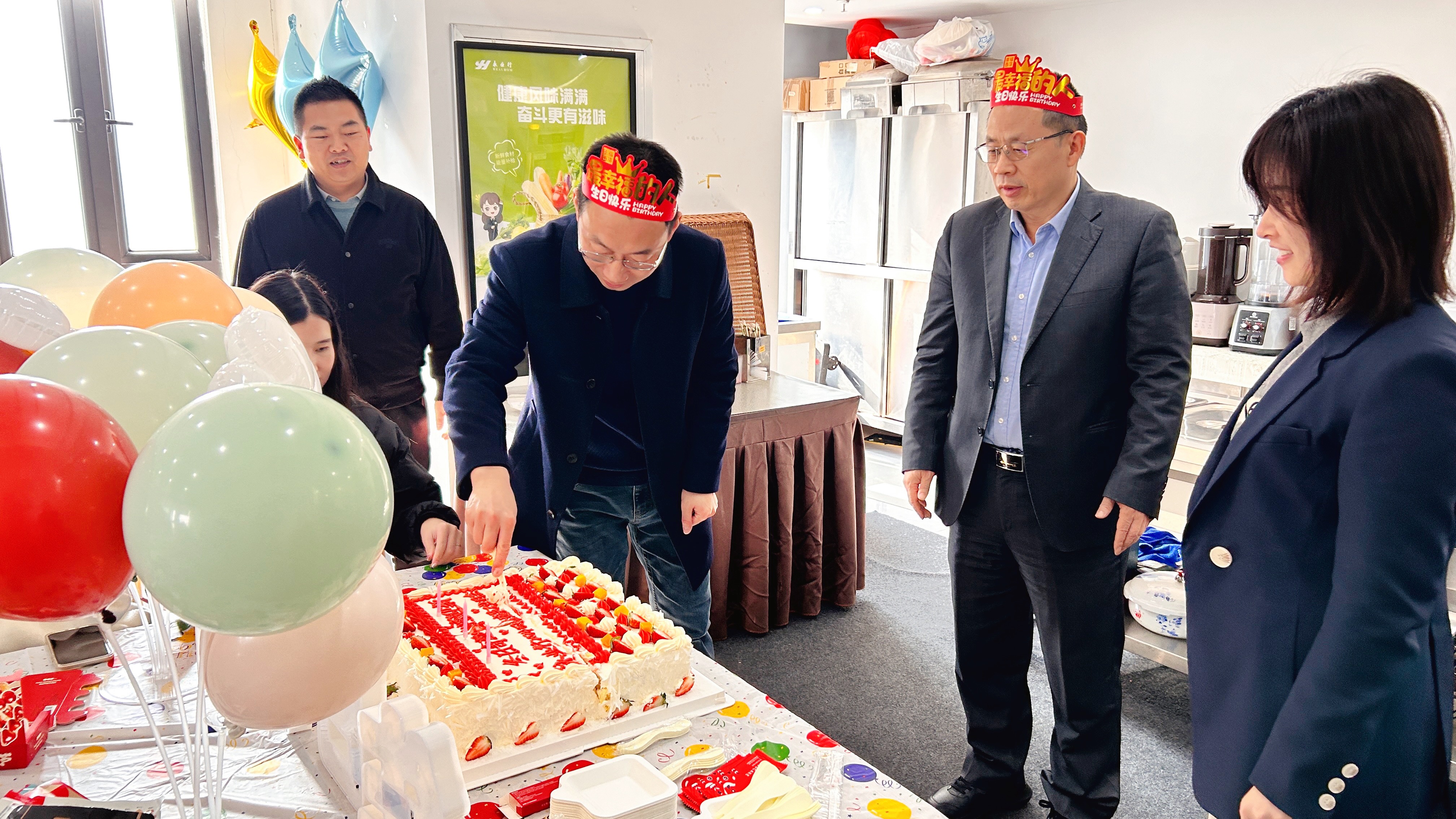 永业行董事长潘世炳、副总裁金建华到场祝贺,潘世炳向所有员工道一声感谢、向四季度生日的寿星们送一份祝福,与寿星代表一起分享蛋糕,祝全体员工及家人新的一年有期、有盼、无忧、无虑,心怀热爱,勇往直前,所愿皆圆。